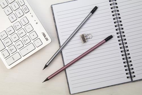 Black wood lead pencil in metallic finish, with black eraser. Sharpened, HB grade.