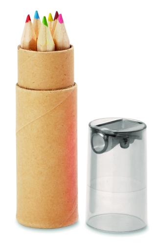 6 piece colouring pencils in recycled paper tube. Pencil sharpener transparent lid.