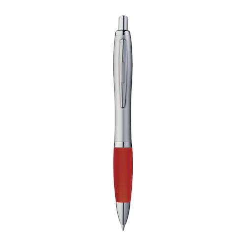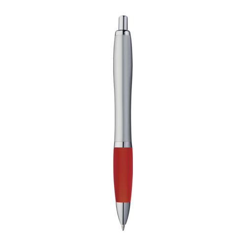 Ball pen with satin finish, rubber grip zone, and blue-writing large refill.