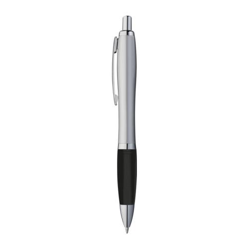 Ball pen with satin finish, rubber grip zone, and blue-writing large refill.