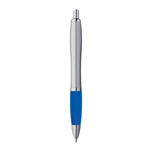Ball pen with satin finish, rubber grip zone, and blue-writing large refill.
