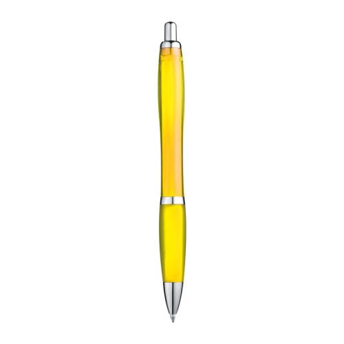 Transparent ball pen with silver metal clip, rubber grip zone and blue-writing large refill.
