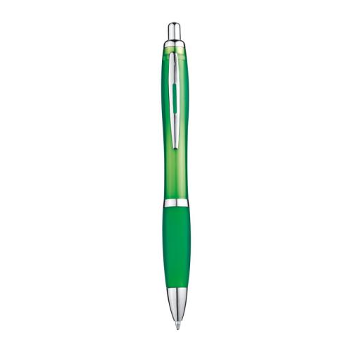 Transparent ball pen with silver metal clip, rubber grip zone and blue-writing large refill.