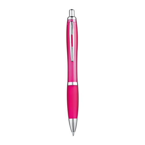 Transparent ball pen with silver metal clip, rubber grip zone and blue-writing large refill.