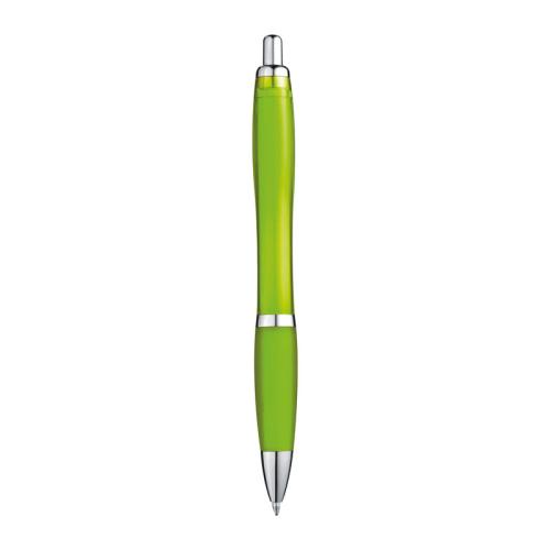 Transparent ball pen with silver metal clip, rubber grip zone and blue-writing large refill.