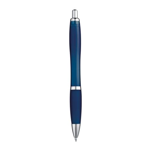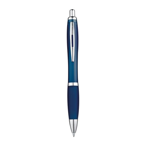 Transparent ball pen with silver metal clip, rubber grip zone and blue-writing large refill.