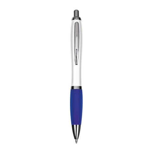 Plastic ball pen with white barrel, metal clip, blue-writing refill, and coloured rubber grip.