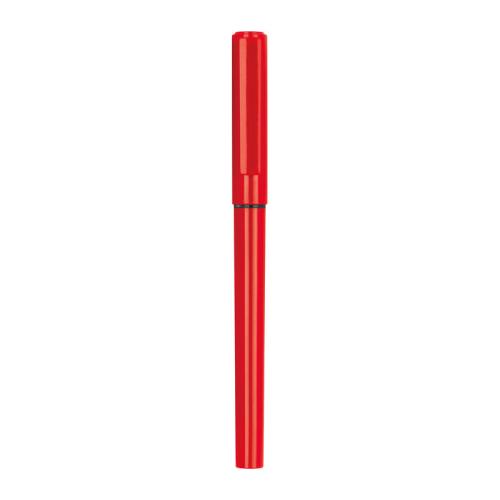 Plastic rollerball pen with lockable cap, plastic clip and large blue ink cartridge.