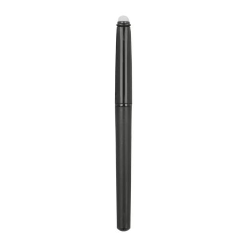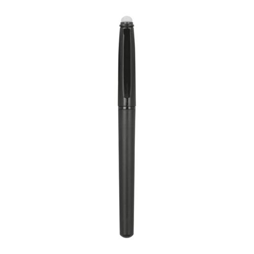 Erasable plastic gel pen with matching eraser on the outside of the cap. The pen colour matches the writing colour.