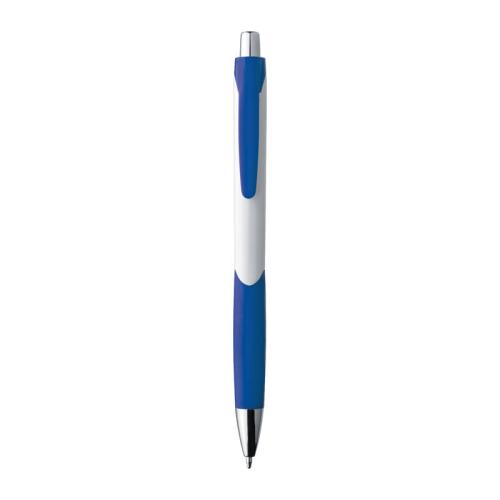 Ball pen with push mechanism, rubber grip zone, blue-writing refill, metal pusher and tip.