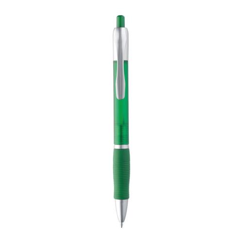 Plastic ball pen with push mechanism, blue-writing refill, and soft rubber grip zone.