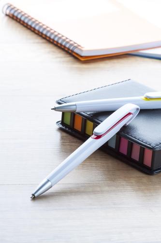 Plastic ballpoint pen with white barrel and silver tip. With blue refill.