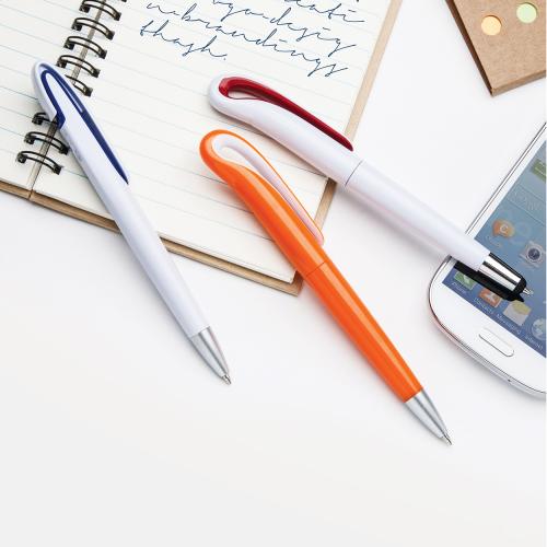 Plastic ballpoint pen with white barrel and silver tip. With blue refill.