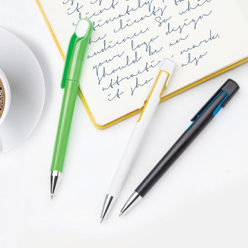 Plastic ballpoint pen with coloured decoration and chrome tip. With blue refill.