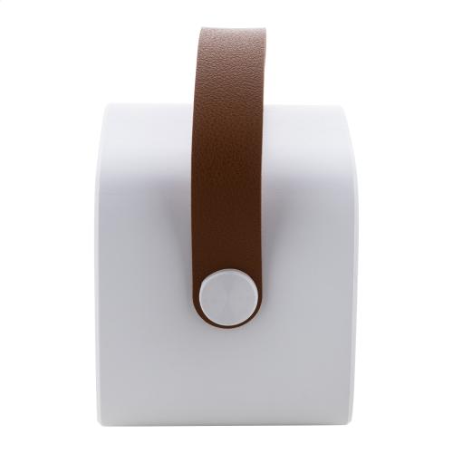 Recycled ABS wireless speaker with PU leather carry strap and built-in rechargeable battery (1200 mAh). Including USB charger cable.