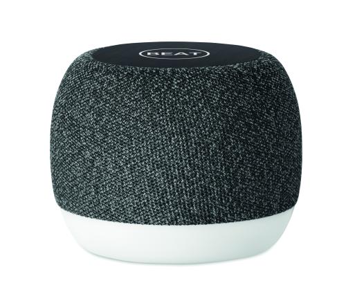 5.0 wireless speaker and 15W wireless charging in ABS and RPET fabric and black coated bamboo detail on top with mood light base. 1 Rechargeable Li-ION 1200 mAh battery included. Includes an SD card port and an AUX/ USB cable. Output data: 5W, 3 Ohm and 5V. Playing time