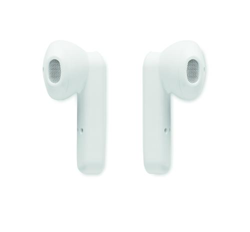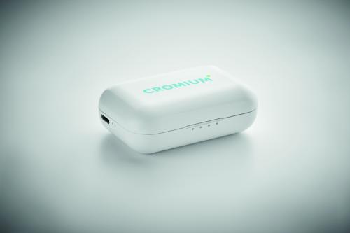 Set of 2 True Wireless Stereo (TWS) 5.3 earbuds with microphone 30 mAh battery built-in. Playing time approx. 3 hours. Auto-pairing. Including a micro USB charging cable and a 185 mAh charging station. Made from recycled ABS.