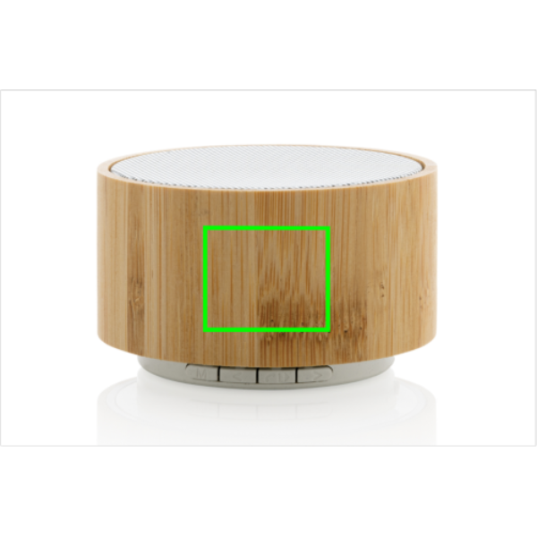 3W wireless speaker made with FSC® 100% bamboo casing and RCS (Recycled Claim Standard) certified recycled ABS. Total recycled content: 16% based on total item weight. RCS certification ensures a completely certified supply chain of the recycled materials. The speaker has an integrated light at the bottom. The speaker is equipped with a 300 mAh battery to ensure up to 3 hours of playing time and BT4.1 for smooth connection and clear sound. Connection range up to 10 metres. With mic to answer calls. Packed in FSC mix FSC® box. Including RCS certified recycled TPE charging cable. Item and accessories 100% PVC free.