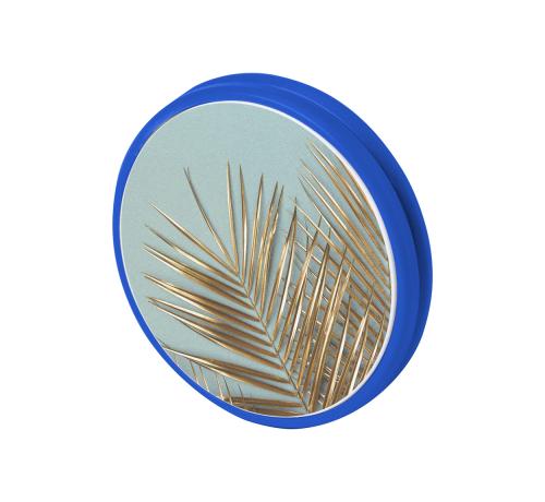 Round shaped, plastic mobile holder with self-adhesive base.