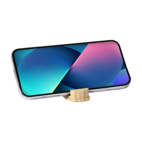 USB charger cable in ecological wheat straw plastic case with carabiner and bamboo mobile holder lid. With micro USB, USB-C and Lightning connectors. With USB and USB-C inputs.
