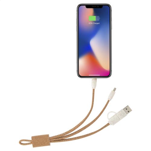 Natural cork and ecological wheat straw plastic charger cable with micro USB, USB-C and Lightning connectors. With USB and USB-C inputs.