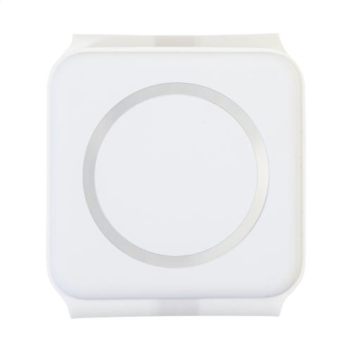 Foldable mobile phone holder and wireless charger set in recycled ABS. With magnetic wireless fast charger (15W), wireless charger (5W) for earphones and wireless charger (2,5W) for smart watches (Apple® only). Including self-adhesive metal ring for phones without a magnetic surface. Including USB charger cable.