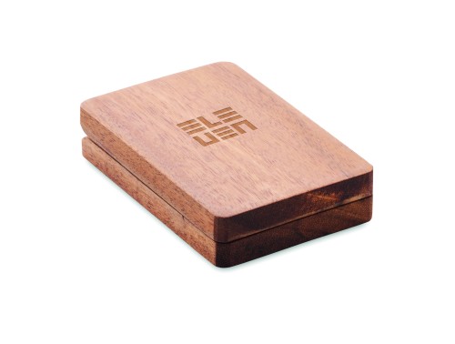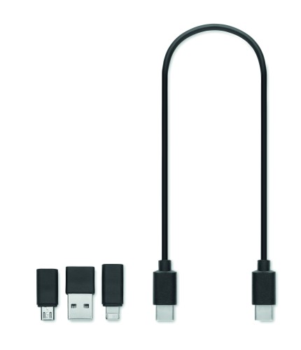 3-in-1 charging and data transfer cable with different connectors. Presented in acacia wood box. Type-C to Type C cable, C to USB-A, C to micro-B, C to lightning connectors.