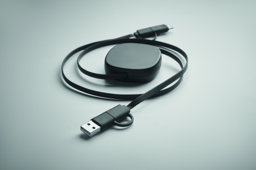 60W retractable cable in recycled ABS casing. Input: 2-in-1 Type-C and Type-A. Output: Type-C and micro-B (2 in 1 pin). Cable length: 80 cm.
