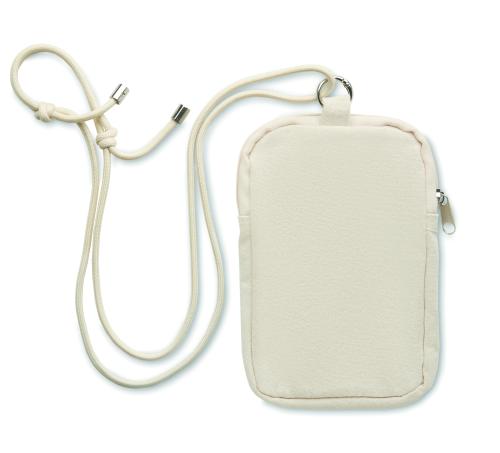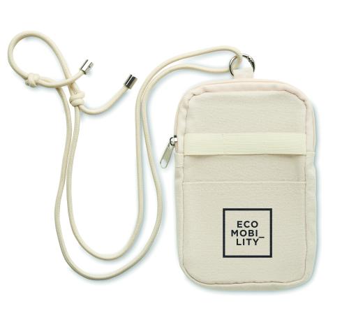 Cross body smartphone bag in recycled cotton with RPET polyester adjustable lanyard with open pocket on front side. 280 gr/m².