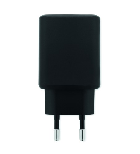 EU 2-pole GaN wall charger with 65W quick charge, 1 USB-A and 1 Type-C ports. Supports Power Delivery technology. Ideal travel item.
