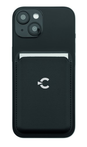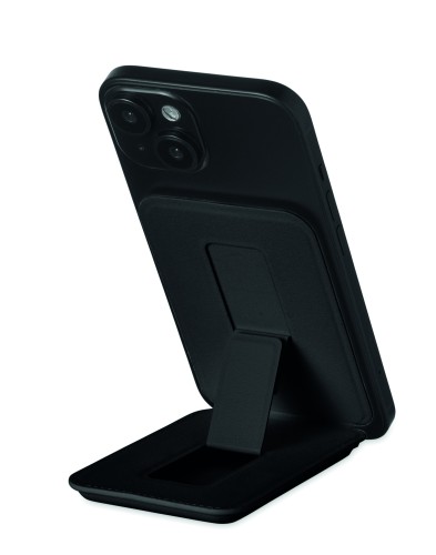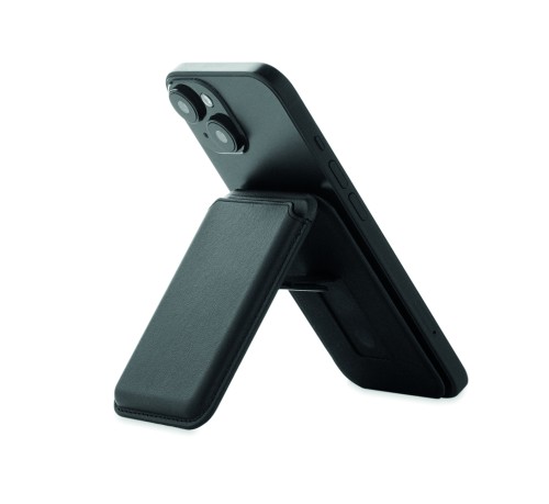 Magnetic PU leather credit card holder (for 3 cards) with stand functionality. It includes an additional metal ring.
