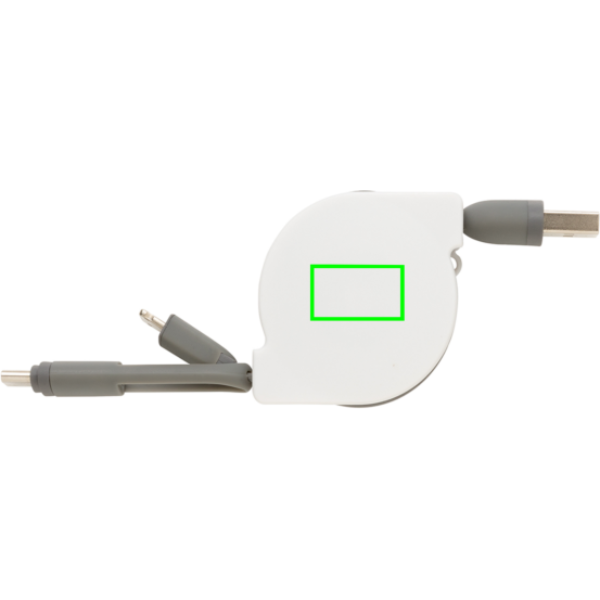 Compact and retractable 3 in 1 charging cable with type C and double-sided connector for IOS and Android devices that require micro usb. Because of the retractable mechanism the 100 cm long flat cable can easily be taken anywhere without it getting tangled. ABS case with TPU material cable. Also suitable for syncing.