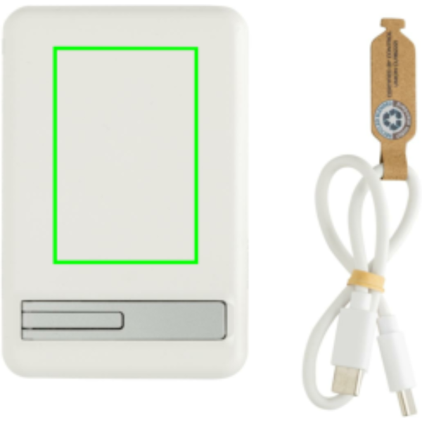 5.000 mAh pocket size powerbank with 5W magnetic wireless charger with a case made out of RCS certified recycled ABS plastic and FSC certified bamboo.. RCS (Recycled Claim Standard) is a standard to verify the recycled content of a product throughout the whole supply chain. Total recycled content: 22 % based on total item weight.The powerbank contains a long lasting grade A 5.000 mAh lithium polymer battery. With integrated phone stand. The power indicators will indicate the remaining energy level so you always know when to re-charge.; Type-C Input 5V/2.4A; Type C output:5V/2A.4A Item and accessories PVC free. Including RCS certified recycled TPE charging cable. Packed in FSC® mix packaging.