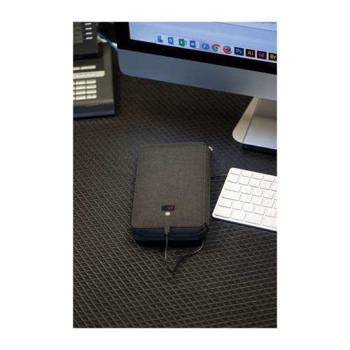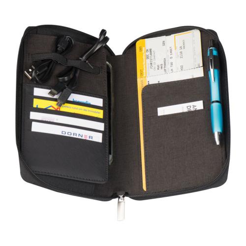 Travel wallet with integrated 4000 mAh power bank, pen loop, pockets, mobile phone holder, and charging cable. We will print your logo on the outer case.