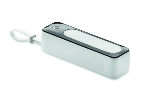 Powerbank with flashlight. 5000 mAh. ABS. Outputs: USB-C and USB-A up to 10W. Input: USB-C 10W. 6 COB lights (18 lm each). Built-in USB-C cable to USB-C cable with USB-A adapter included.