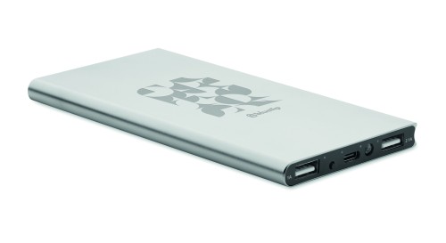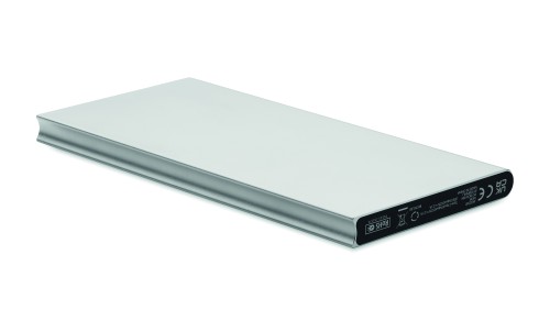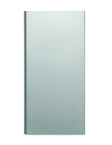 Powerbank. 8000 mAh. Recycled aluminium and RABS (GRS). Outputs: USB-C and USB-A up to 10W. Input: USB-C 10W. USB-C to USB-C cable (2A) with USB-A adapter included.