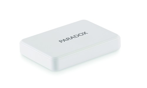 Powerbank PD 20W. 5000 mAh. Recycled ABS (GRS). Outputs: USB-C up to 20W. Input: USB-C 18W. 4 LED indicators. USB-C to USB-C cable (2A) with USB-A adapter included