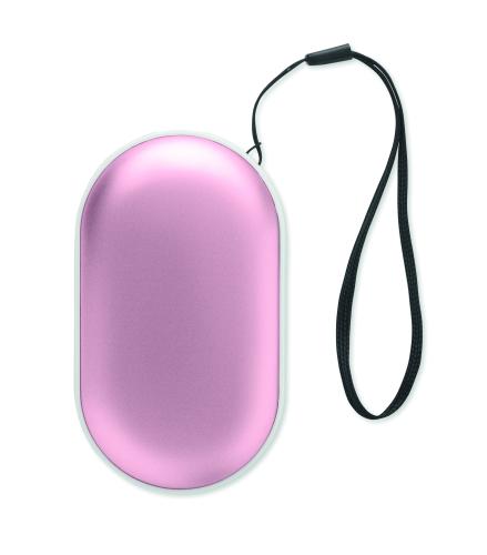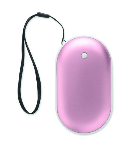 Aluminium electric hand warmer with 3 heat levels (45°C, 50°C, 55°C) and built-in 5000mAh power bank. Dual-sided heating, Type-C input/output, USB-A and DC5V/2A output and charging cable included.