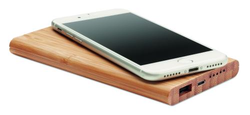 Wireless powerbank. 6000 mAh. Bamboo. Outputs: USB-A up to 10W. Wireless charging up to 5W. Input: USB-A 10W. 4 LED indicators. Built-in Micro USB plug. USB-A to Micro USB cable (30 cm) with USB-C adapter included.