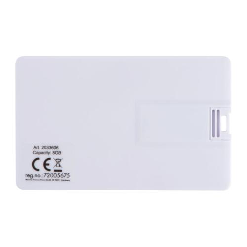 USB card with 8GB storage capacity. Thanks to its flat shape it can be easily stowed anywhere. The large white area is perfect for digital print.