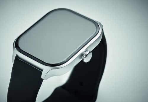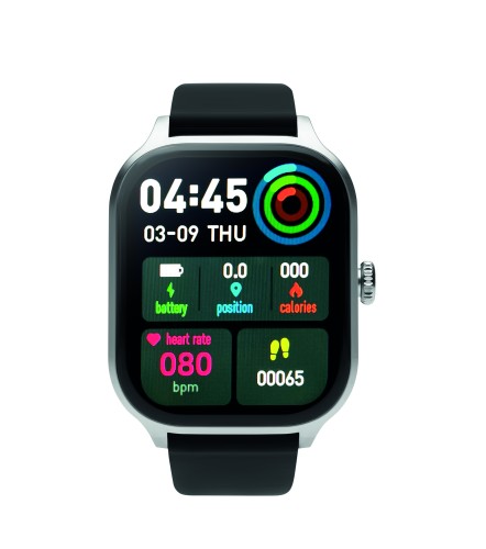 5.4 wireless smart health watch in zinc alloy with silicone strap. 2.01 inch touch LCD display. Rechargeable Li-Pol 180 mAh battery. Requires a free app (HryFine available in both iOS and Android).