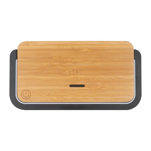 10 Watt bamboo wireless charger with reading lamp for smartphones, including a charging cable. Charges all QI-enabled smartphones. Your logo will be engraved on the charger.