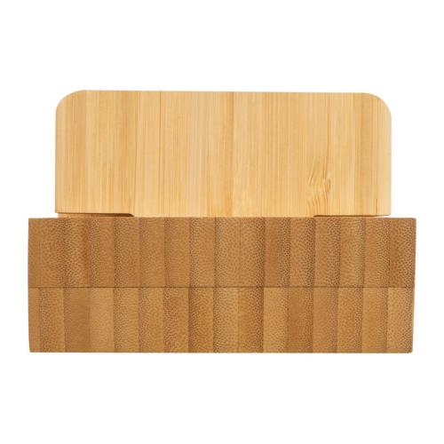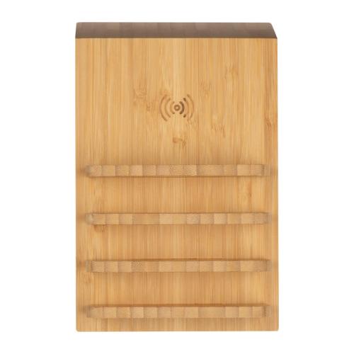 Bamboo charging station for four smartphones or tablets with one wireless charging slot, two USB ports and one USB-C port. Charging cable included.