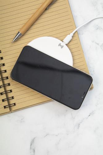 Recycled ABS plastic fast wireless charger (15W). Including USB charger cable.