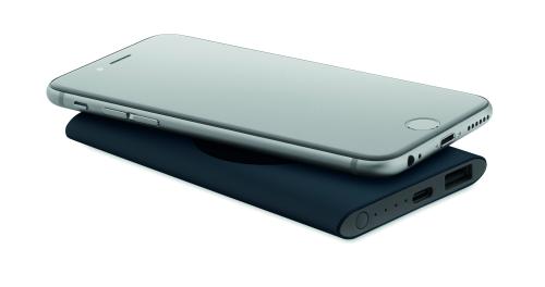 Wireless powerbank. 5000 mAh. Recycled aluminium and ABS (GRS). PD 18W. Outputs: USB-C 20W and USB-A up to 18W. Wireless charging up to 15W. Input: USB-C 18W. USB-C to USB-C cable (2A) with USB-A adapter included.