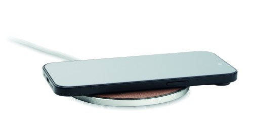 Wireless charger in recycled aluminium with walnut top detail. Connect device to your computer, place smartphone on it and allow it to charge. Output: DC 9V/1.67A (15W).