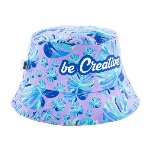 Custom made, RPET bucket hat with all over sublimation printed graphics. 600D RPET polyester (220 g/m²) with distinctive RPET label. MOQ: 25 pcs / size. Available in 3 sizes: S (ø55cm for kids), M (ø58cm) and L (ø60cm).