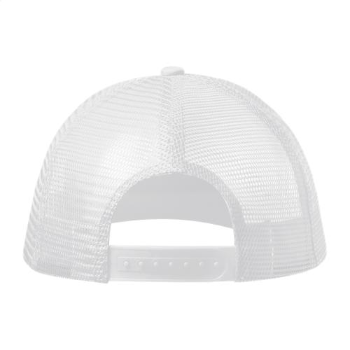 5 panel baseball cap with mesh back and plastic size adjustment strap, polyester.