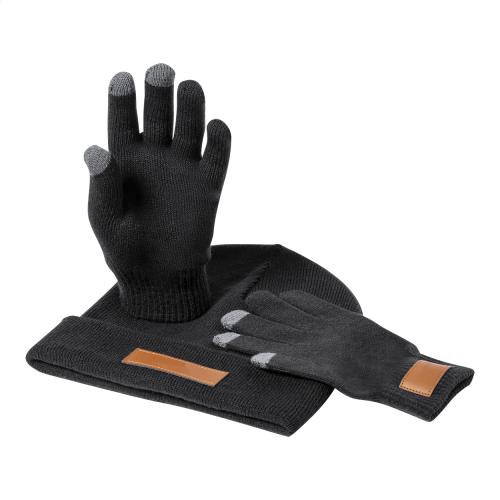 Acrylic knitted winter hat and touch screen gloves with printable PU leather patches, in one size for adults.