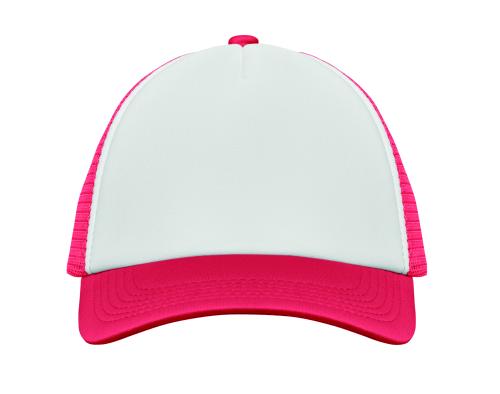5 panel truckers cap in polyester 140-150 gr/m² with adjustment plastic snap closure. White front panel and colour visor in polyester jersey with foam backing. Other panels in colour mesh. Size 7 1/4.